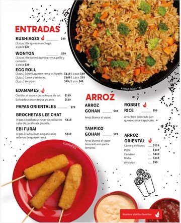 Este es un menú de entradas (estilo sushi/teppanyaki) con opciones variadas que van desde entradas clásicas hasta arroces más elaborados.