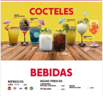 Para completar tu experiencia, aquí tienes la sección de Bebidas y Cocteles, que ofrece desde refrescantes opciones clásicas hasta combinaciones exclusivas de la casa: